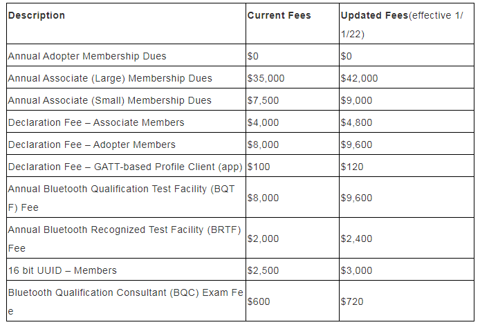 SIG官方发布最新消息:SIG的费用,将从2022年1月1日起开始涨价20%。今年作为调价前的最后一年,建议产品认证客户应提前做好产品规划,尽量多的产品安排在今年完成蓝牙产品的资格认证。